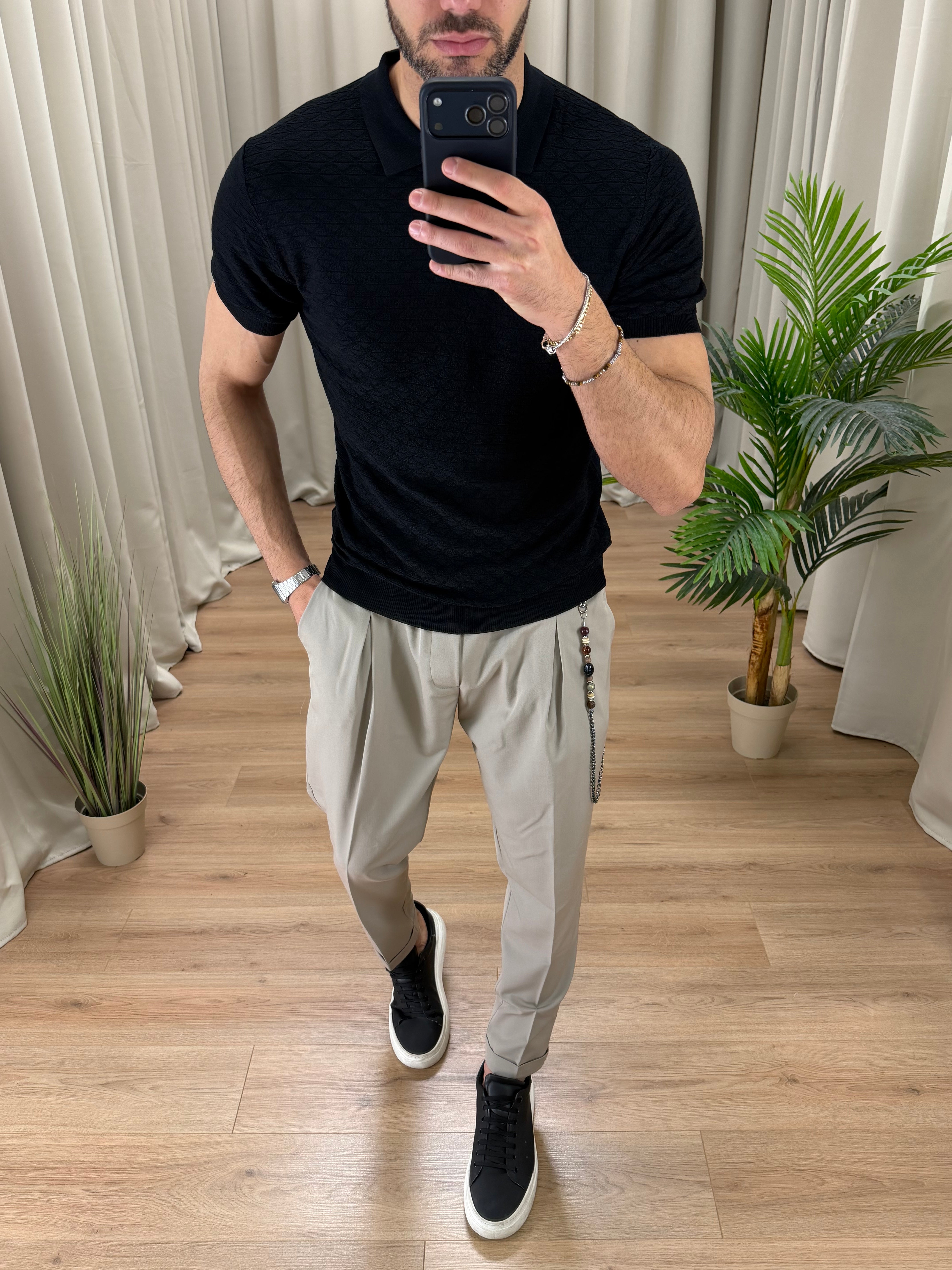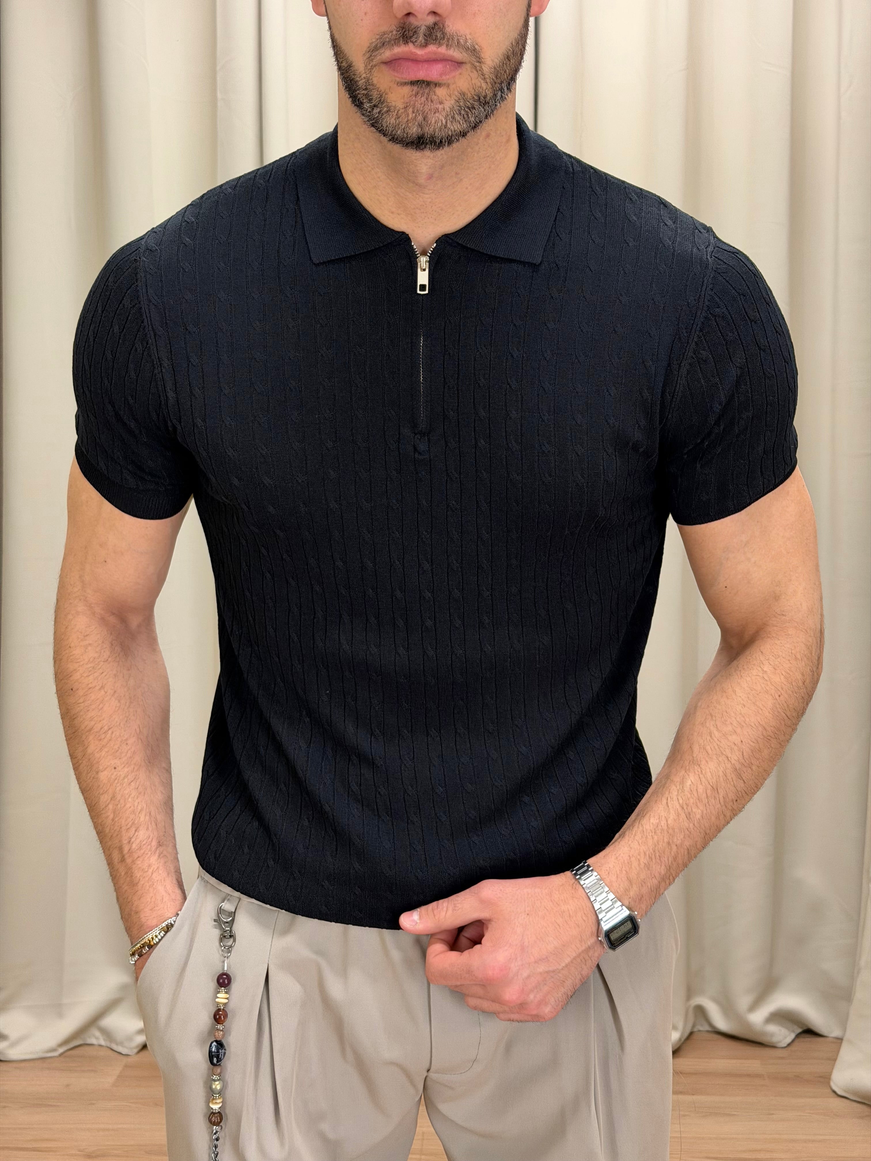 Il modello è alto 189 cm e pesa 89 Kg. Indossa la taglia XL