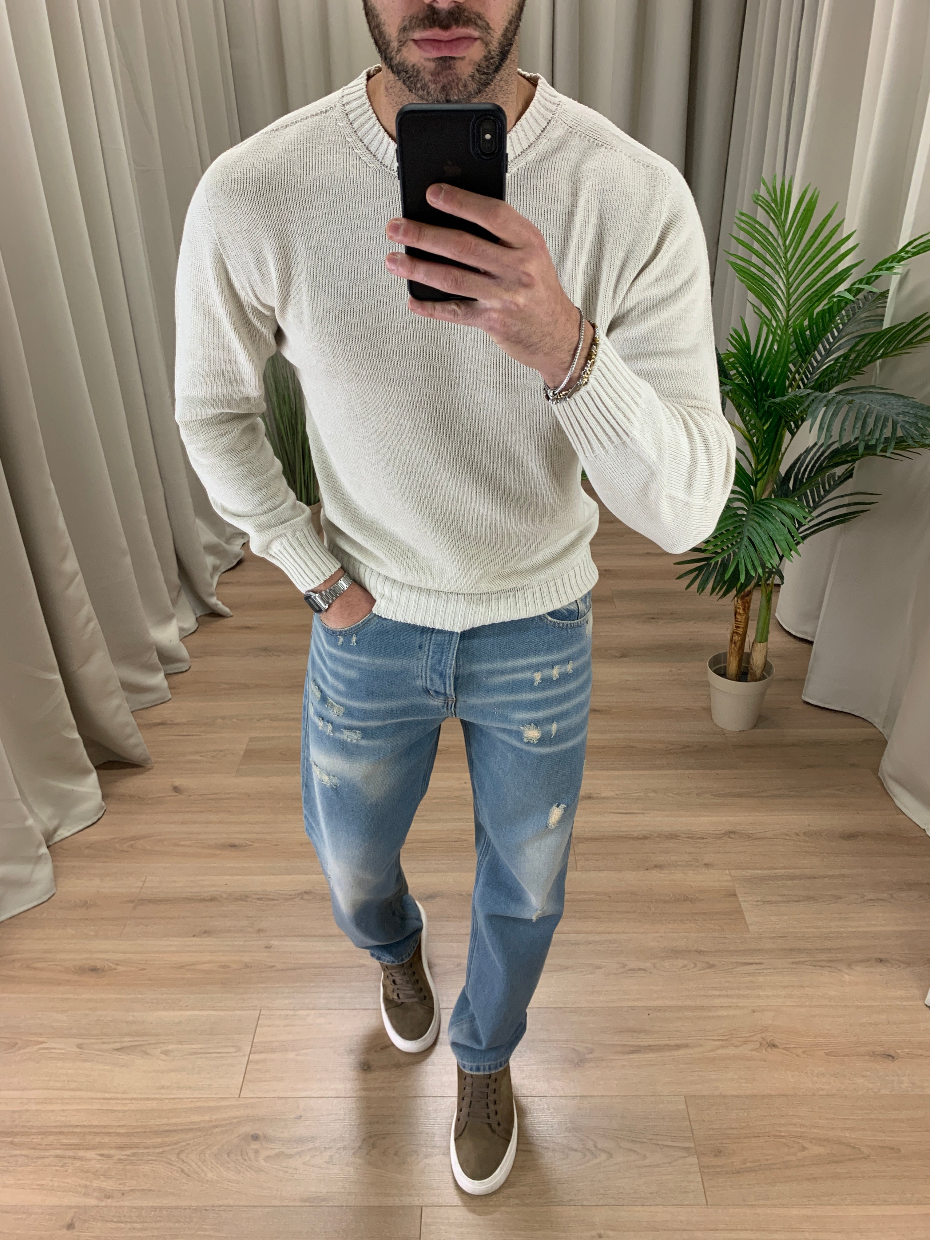 Il modello è alto 189 cm e pesa 89 Kg. Indossa la taglia 50