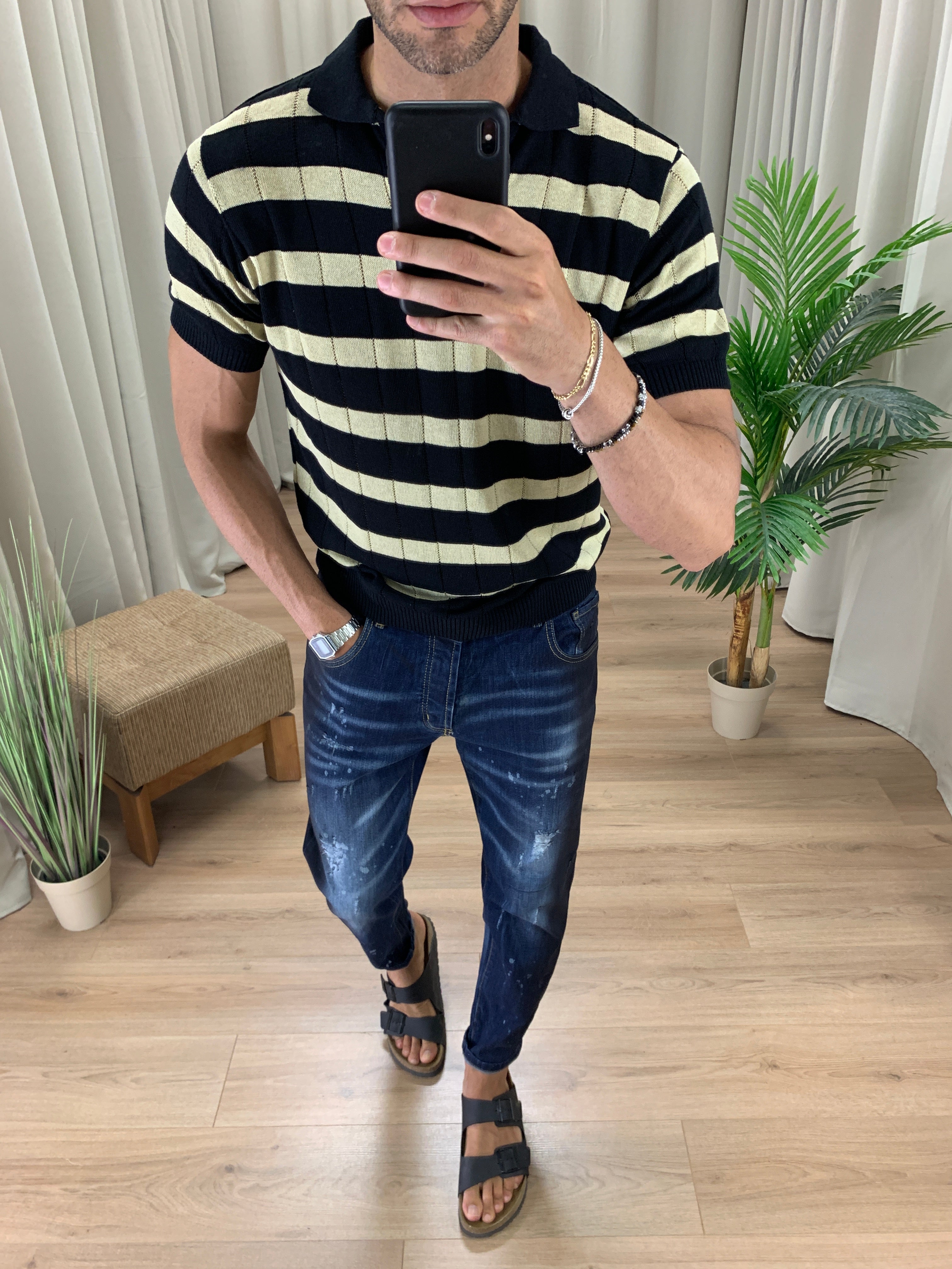 Il modello è alto 189 cm e pesa 89 Kg. Indossa la taglia 50