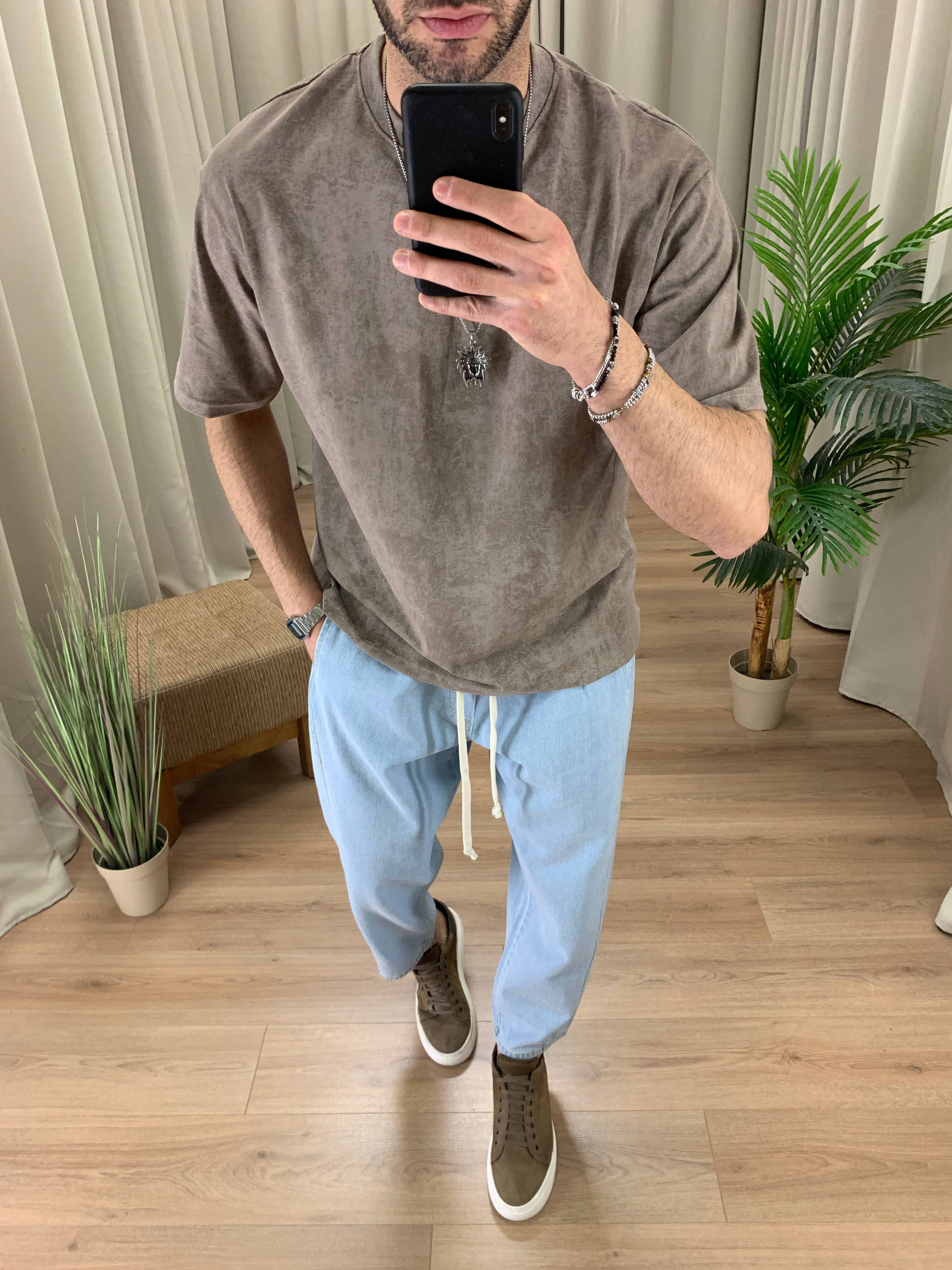 Il modello è alto 189 cm e pesa 89 Kg. Indossa la taglia 50