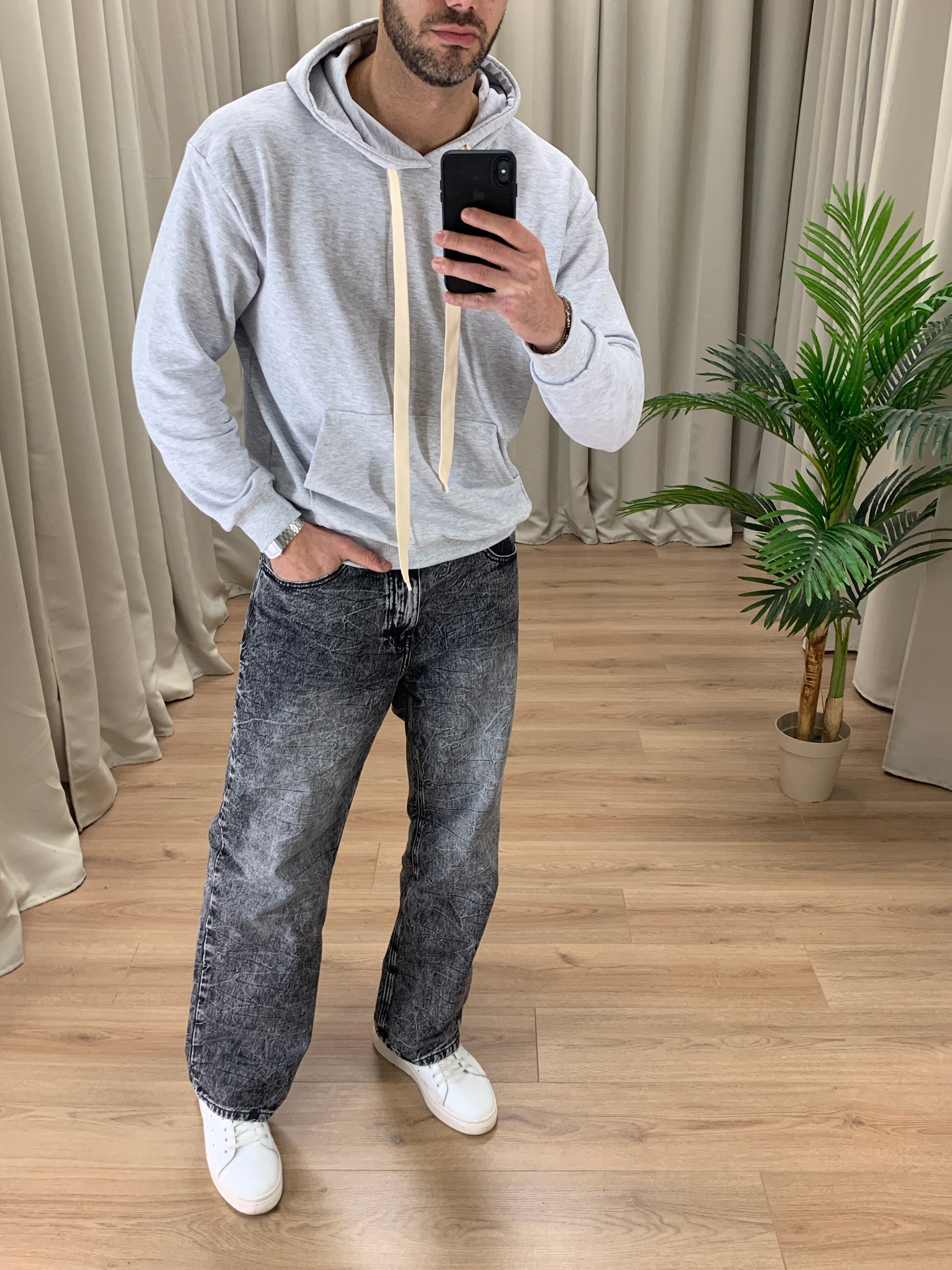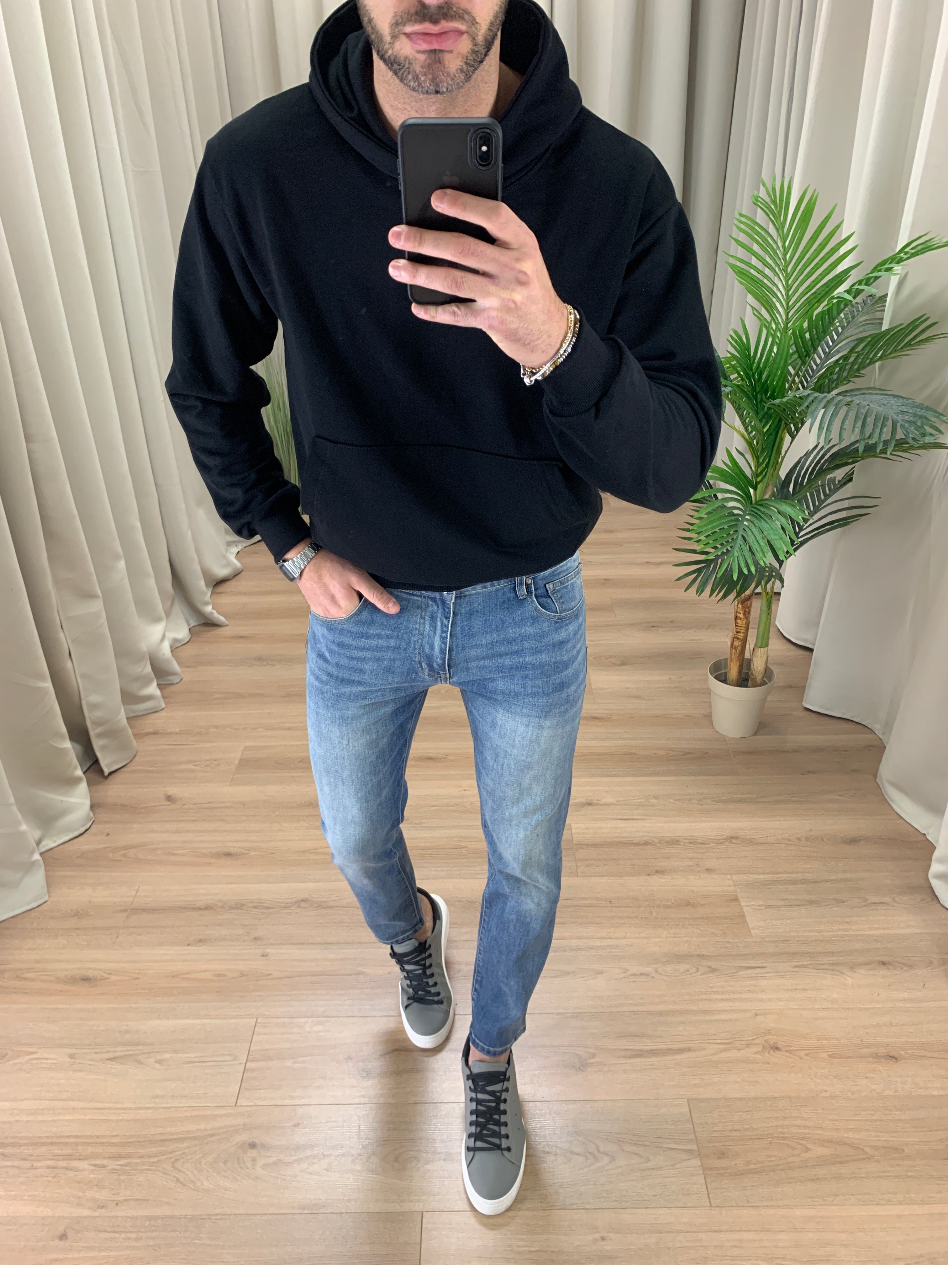 Il modello è alto 189 cm e pesa 89 Kg. Indossa la taglia 50